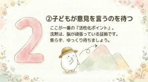 だからこそ、すぐに正解を教えるより、子どもが自分で言葉にたどり着く時間を守ることが大切です。